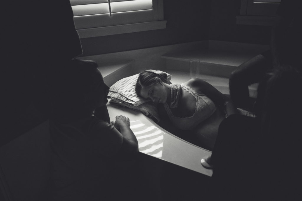 My husband was behind me in the bathtub, pressing on my lower back and hips as my contractions came on. He had us all laughing in between contractions. Eshelle and Becky had me moving throughout the water doing squats and other positions.